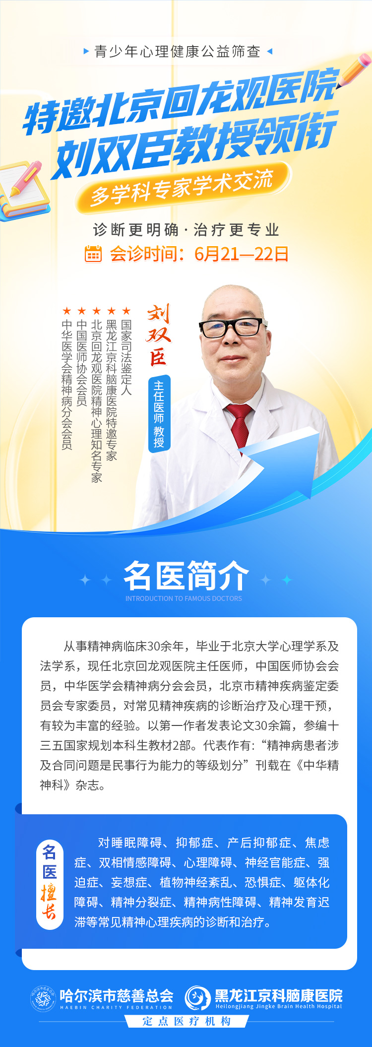 北京回龍觀醫(yī)院劉雙臣教授6月21-22日蒞臨我院會(huì)診